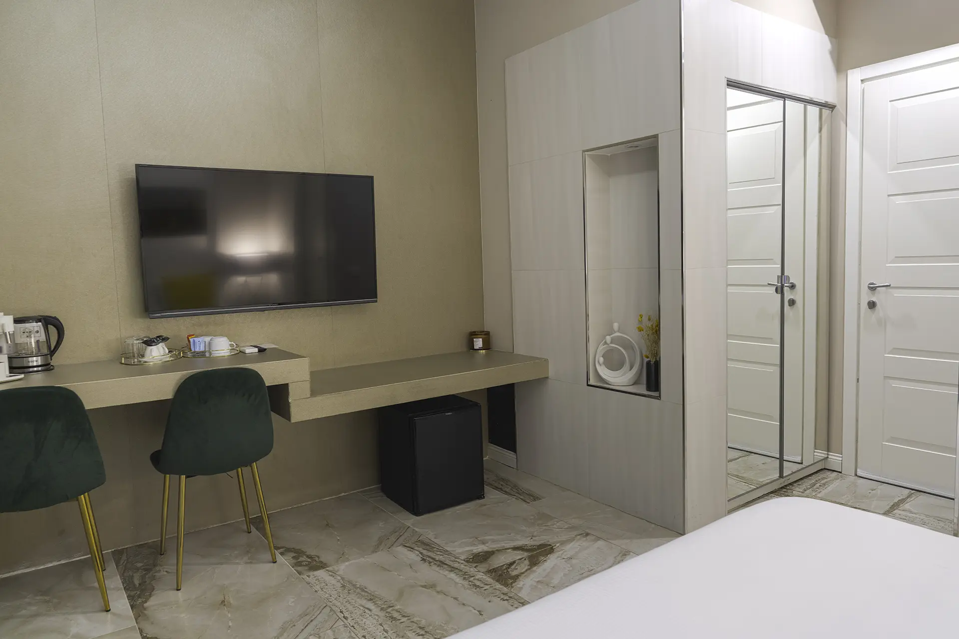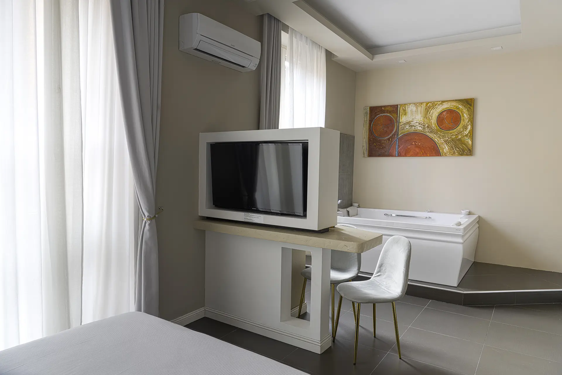 La Suite Prestige è una raffinata sistemazione di 25 mq, pensata per offrire un soggiorno esclusivo nel cuore di Roma. Dominata da un elegante letto matrimoniale King Size, la suite si distingue per la presenza di una suggestiva vasca idromassaggio integrata nell’ambiente, dettaglio che contribuisce a creare un’atmosfera intima e rilassante.