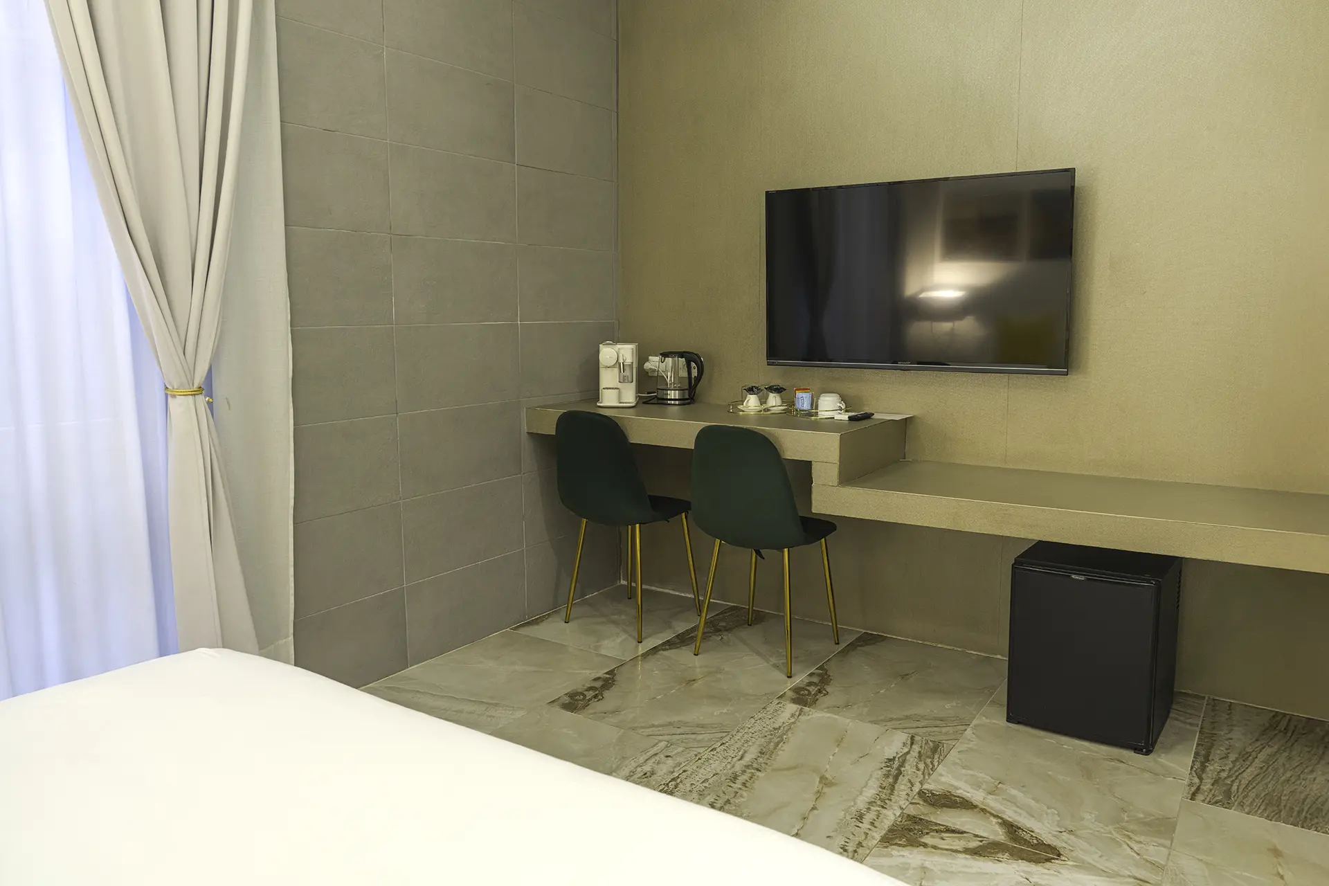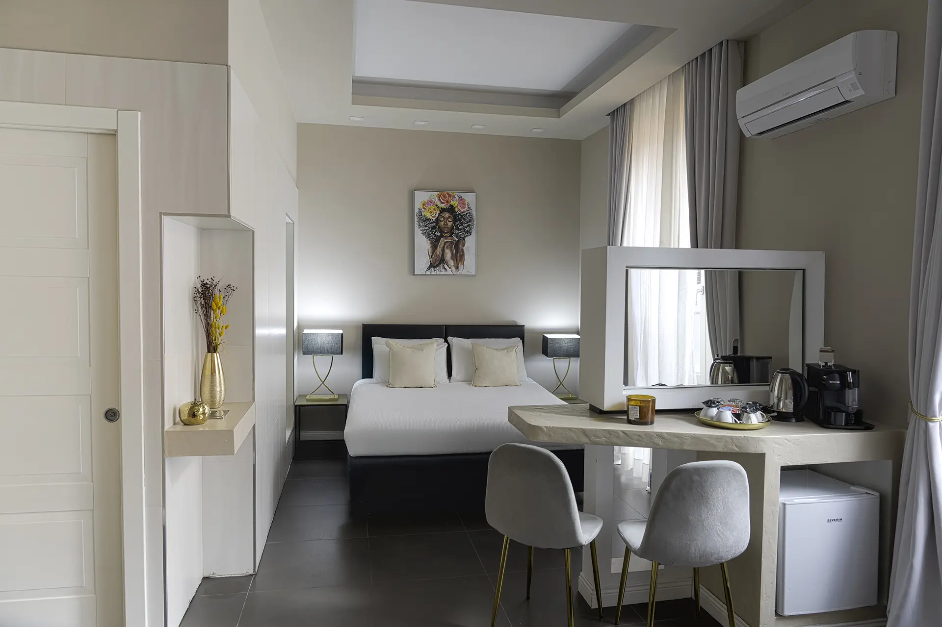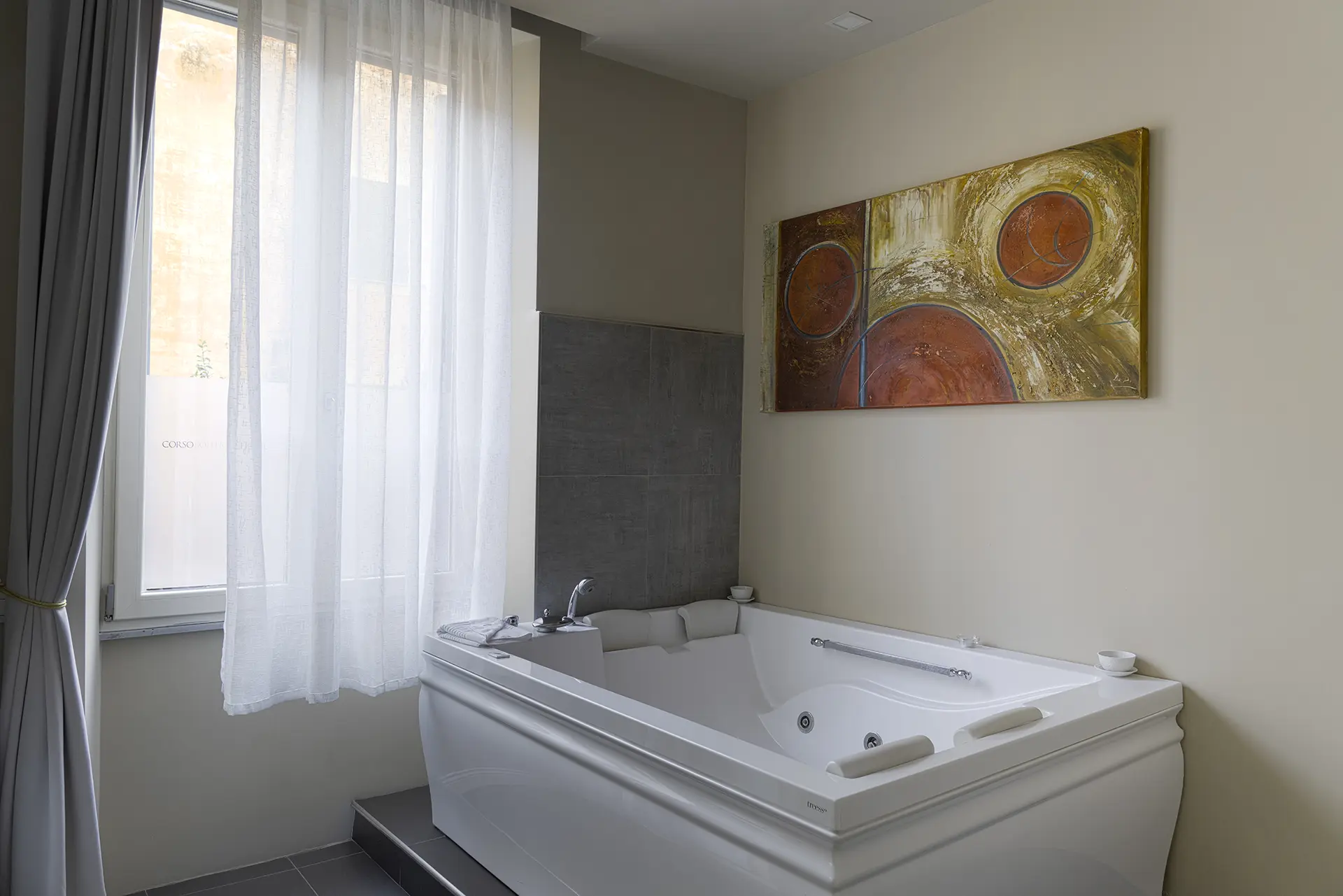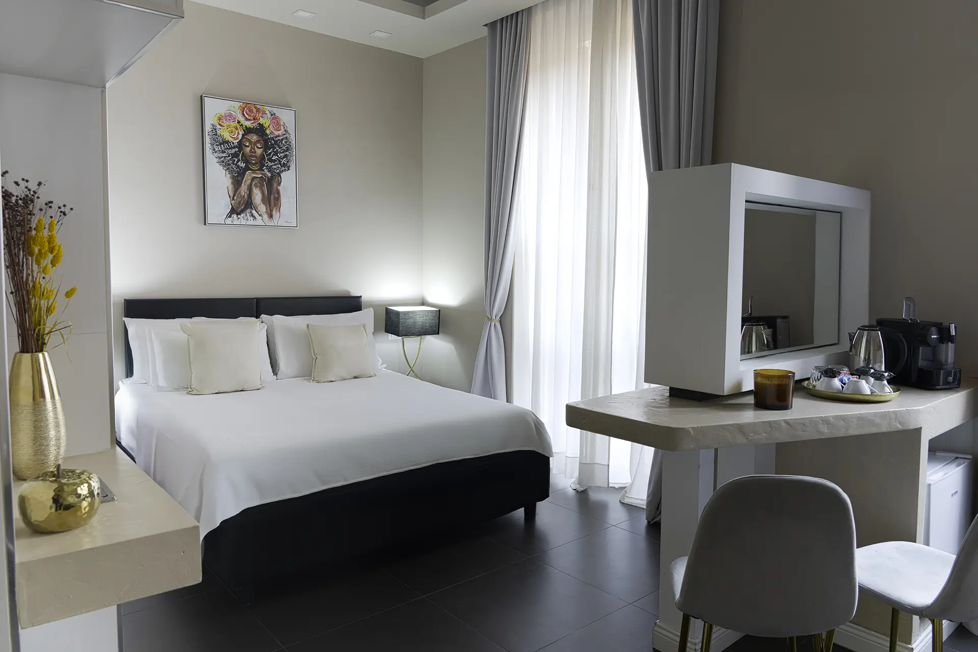 La Camera Deluxe è una raffinata sistemazione di 23 mq, pensata per offrire un perfetto equilibrio tra comfort e design nel cuore di Roma. Dominata da un elegante letto matrimoniale King Size, si distingue per la presenza di una suggestiva vasca idromassaggio a vista sulla zona notte, dettaglio contemporaneo che contribuisce a creare un’atmosfera intima e avvolgente.