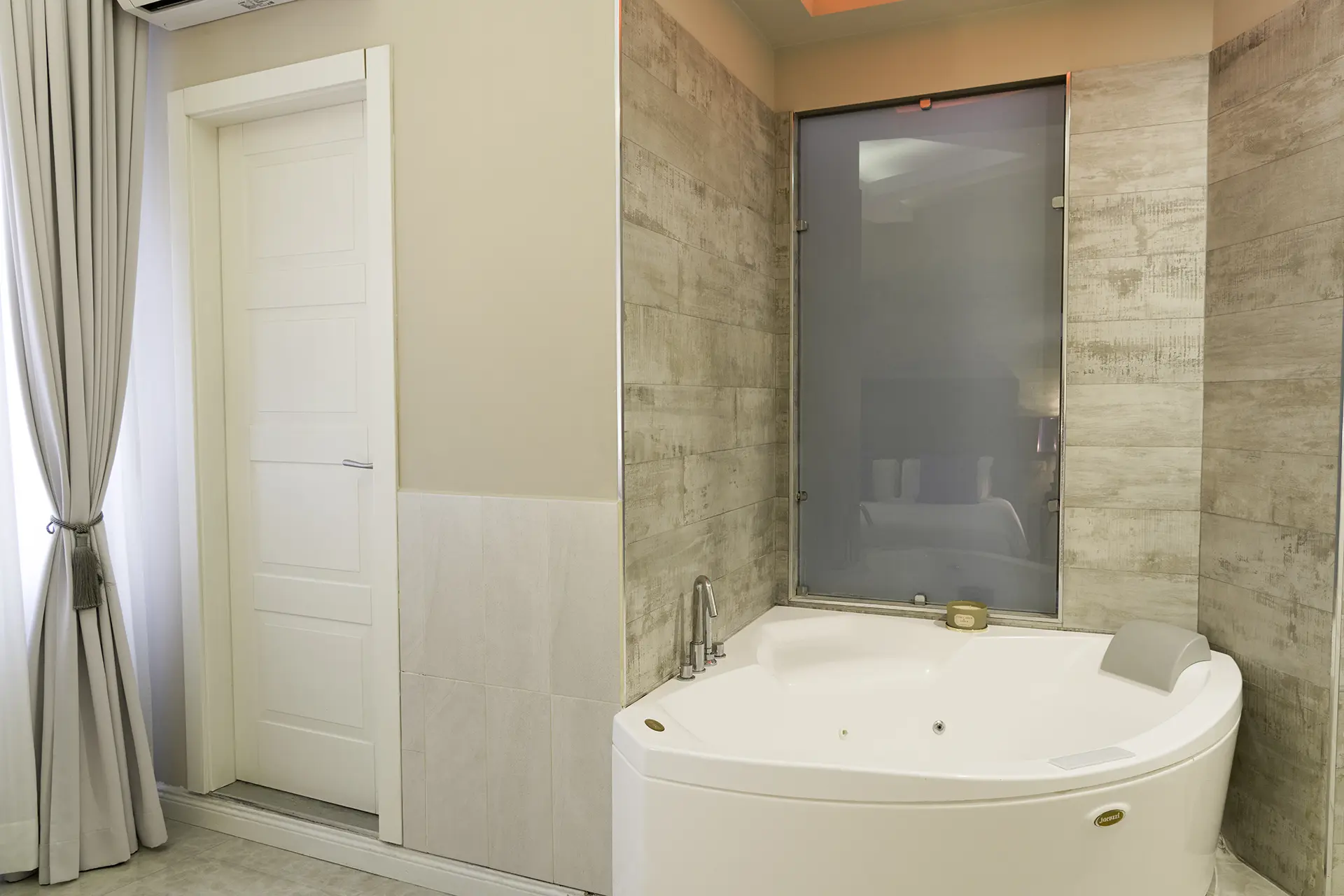 La Suite Executive è una raffinata sistemazione di 25 mq, pensata per offrire un’esperienza di soggiorno esclusiva nel cuore di Roma. Dominata da un elegante letto matrimoniale King Size, si distingue per la presenza di una scenografica vasca idromassaggio circolare, elemento di design che contribuisce a creare un’atmosfera intima e sofisticata.