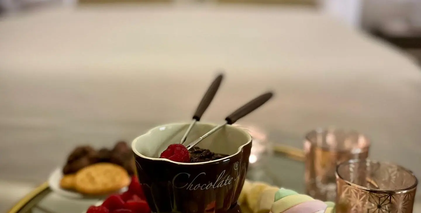 Il segreto per vivere una serata d a sogno insieme al tuo partner? Un trionfo di dolce romanticismo! Prova la nostra deliziosa fonduta di cioccolato fondente con due calici di prosecco, frutta fresca, biscotti croccanti e marshmallows! Densa, morbida, avvolgente e il gioco di un gesto, qu ello di immergere, per scoprire la bontà di una dolcezza indescrivibile.